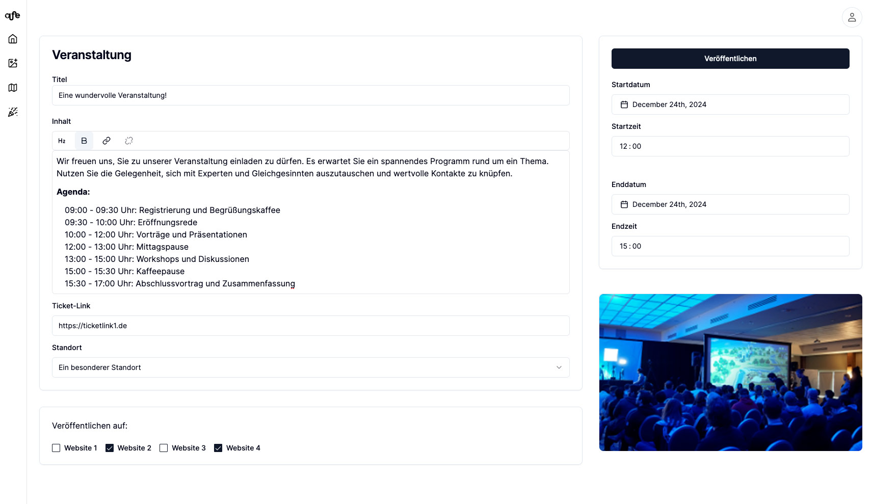 Erfasse deine Events zentral und lass sie automatisch auf allen deinen Webseiten erscheinen. Spare dir die Mühe, jede Seite einzeln zu aktualisieren und gewinne wertvolle Zeit zurück. Sorge dafür, dass deine Zielgruppe immer auf dem neuesten Stand ist. Entdecke jetzt, wie unkompliziert und effizient Event-Management sein kann.